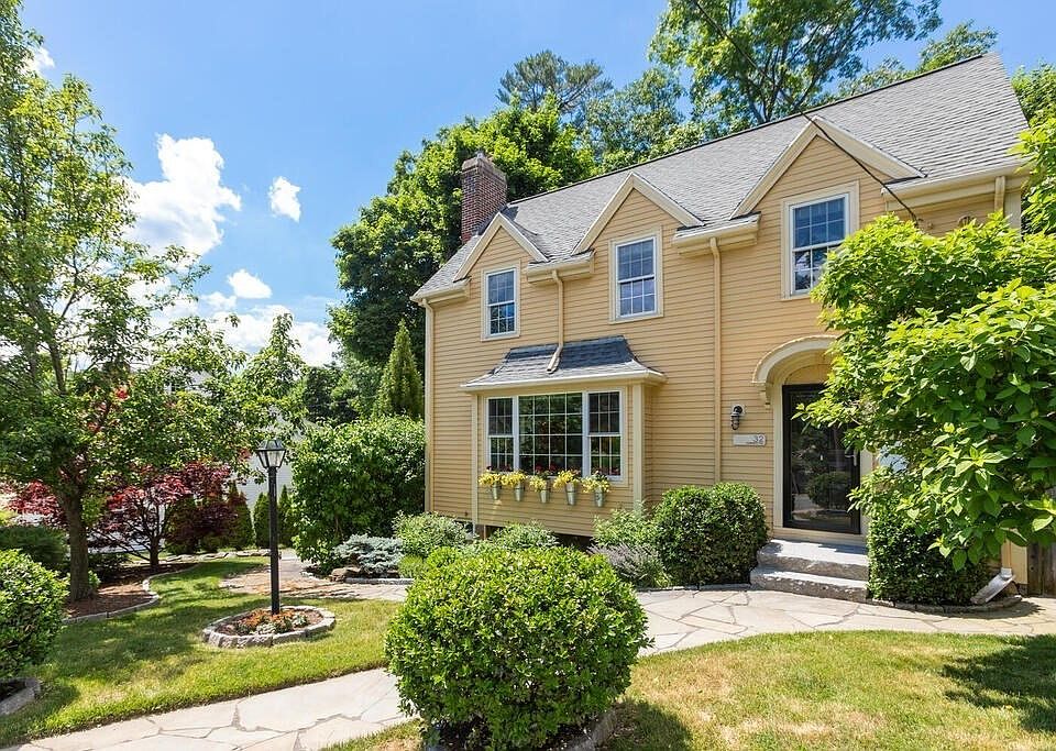 Beautifully renovated Colonial style home, rich in detail and thoughtful contemporary design. Spacious living room featuring fireplace with wood-burning insert, and window seat invites you to stay awhile and relax. Sophisticated kitchen offers custom solid maple cabinets, marble and quartz counters, SS appliances, and a deep/wide farmhouse sink. Renovated full bath has large tiled shower with rain shower head, marble counter backsplash, and designer lights imported from France. Flexible floor plan is great for those work-from-home needs, offering a first floor office/den, exercise room, and unfinished walk-up attic (plumbed & with electric) for future expansion. Amenities include high-velocity a/c, designer lights throughout, excellent closets/storage space, 18' x 10' deck, and a lush, well-landscaped private lot abutting Wright's Park conservation area. All located on a tree-lined street close to hiking trails, and Wright's Pond and beach. Easy access to Bus 100 - Wellington Station