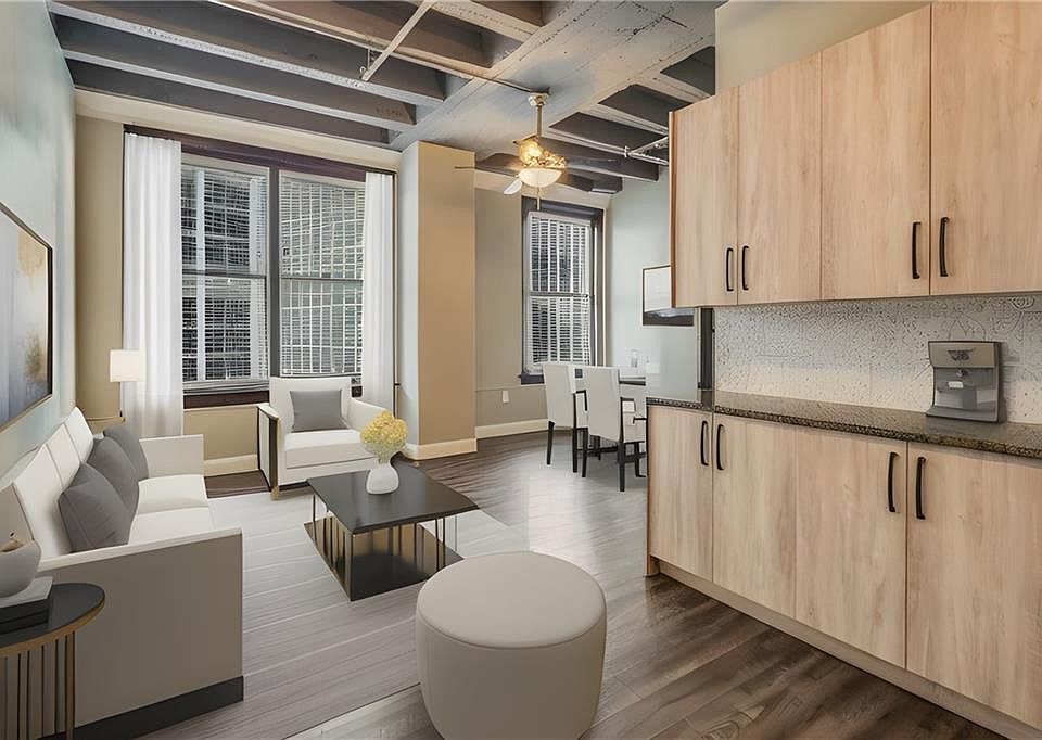 This 2BR/2BA loft enjoys 12th floor views, new wood-look engineered vinyl flooring throughout with refinished original wood windows and custom foyer lighting. The updated kitchen boasts a reconfigured layout and new cabinets, countertops, and backsplash. Both bathrooms have been updated with new tiled stand-up showers, fixtures, tile flooring, removed drop ceilings, and vanities. HOA includes high speed internet, 24-7 concierge, fitness center & roof top deck for building. Owner occupant only, rental units are capped & there is a wait list. About The William Oliver - Atlanta’s first Art Deco skyscraper The 16-story high-rise condominium building sits on Peachtree Street across from Woodruff Park in the core of Atlanta’s Downtown. This building was originally constructed for office use in the 1930’s and was transformed into apartments for the 1996 Olympics. In 2001, it was converted to condominiums and offers 115 units. This tower is also listed on the National Registry of Historic Places.