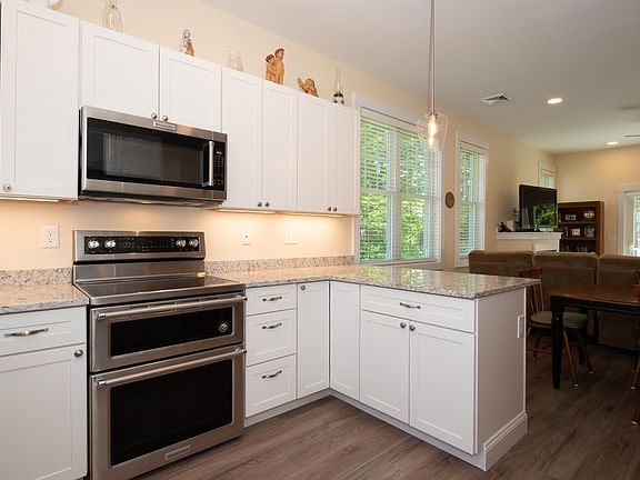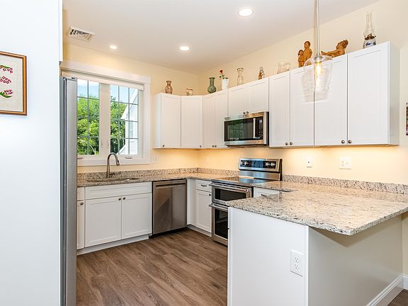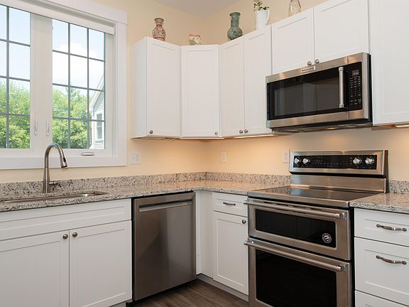 Have you been looking for a one-level maintenance free living with a real two car garage on the seacoast? Look no further than this 2021 built condex at the Village at Great Brook active 55+ community in Eliot! This fantastic unit has everything you need in a beautiful open plan design with a full-sized kitchen featuring granite counters and an island peninsula with breakfast bar that would easily seat 3-4. From the kitchen, the space flows through a dining area and into the living room offering a gas fireplace, ceiling fan, and sliders to the composite deck overlooking a small backyard with a natural buffer. The master suite is oversized, with walk-closet and ensuite has lots of storage w/ granite-topped double vanity, plus a full sized low curb step in shower. This unit has a second bedroom with two side by side closets and another full bath also with low-curb step in shower and granite-topped vanity. The hallway to the garage offers a large storage closet, a small broom closet, and a full-sized laundry closet accommodating side by side washer and dryer. The unit is heated by natural gas forced air furnace and cooled by central A/C. The entire unit is floored with luxury vinyl plank for easy keeping and good looks for years to come. Pets are welcome in this community too, as well as visits from family & friends - and this unit offers parking right in its own driveway with room for all guests! Showings start on Friday 8-5-22. Open House Saturday 8/6/22 from 10-1pm & 8-7 2-4