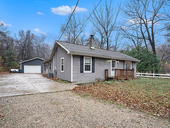 Welcome to this beautifully maintained ranch! This Plainwell Schools home sits on a wooded lot and features new flooring and updated bathrooms. Located within a half mile of Pine Lake and the public boat launch, this home is in a great private country location but still close to all that Plainwell has to offer. The home has a spacious living room with a wood burning stove/fireplace. There is also a nice sized kitchen with gorgeous countertops.The family room is huge with a brick woodburning fireplace and slider to the deck. The primary bedroom has double closets and the 2nd bedroom has French doors that lead to the deck. Outside is a huge deck overlooking the backyard and a 4 car detached garage with a new ceiling and plenty of storage. This is a spectacular home ready for new owners!