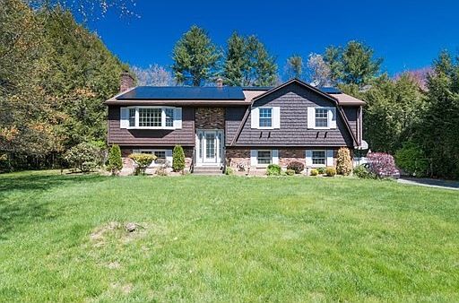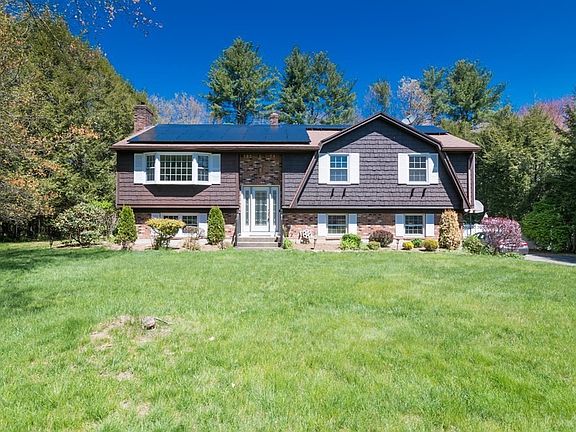MOVE IN READY! Raised ranch located on a private lot near the CT line. This home shines with the interior freshly painted in a neutral grey tone and refinished hardwood floors in all the main floor rooms. Open floor plan concept. Living room with a fireplace and a sunny bay window. The dining room is open to both the living room and kitchen with a slider to the two-tiered deck with a screened gazebo. White kitchen with an island and upscaled appliances. Primary bedroom is ensuite with a 3/4 bath. Two additional bedrooms on this level. The lower level makes a great family room with a pellet stove, porcelain tile flooring, half bath/laundry combo and exterior access. Enjoy the summer with your in-ground pool in your back yard oasis or stay cool inside with central a/c. Adding to the value and peace of mind are a solar system (owned), replacement windows, entry system, Andersen sliders, garage doors, Buderus on-demand boiler, updated baths, six panel doors and a shed. Welcome home!