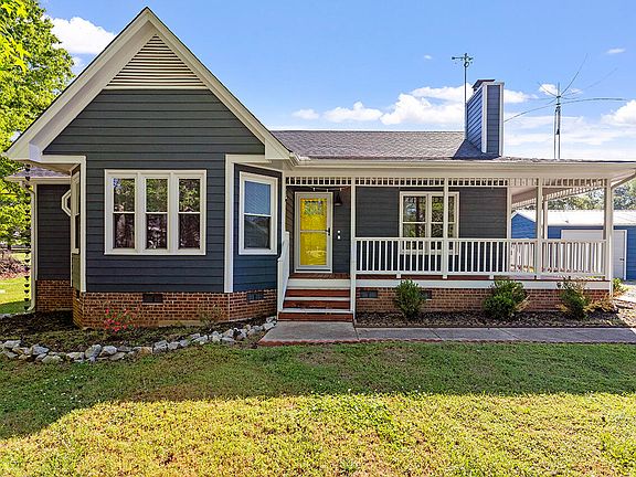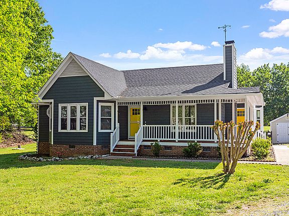 This inviting 3-bedroom ranch-style residence boasts a picturesque exterior with a sprawling, covered front porch, perfect for relaxing evenings and warm welcomes. Step inside to discover a tastefully updated interior, where every detail has been carefully crafted to offer both style and functionality. The spacious family room immediately draws you in with its cozy fireplace, creating the perfect ambiance for gatherings with loved ones. Towering vaulted ceilings add a sense of grandeur and airiness, enhancing the room's inviting atmosphere. Adjacent to the family room, the sleek achromatic kitchen beckons with its clean lines and contemporary design. Stainless steel appliances gleam against the backdrop of crisp white cabinetry, while a convenient breakfast bar offers a casual spot for dining or enjoying your morning coffee. Alternatively, bask in the natural light streaming through the bay window in the breakfast nook, creating a tranquil space to start your day. Retreat to the primary bedroom, where a rustic barn door adds a touch of character and privacy. Here, you'll find a luxurious ensuite bathroom complete with an oversized mirror, dual vanity, and a spacious walk-in closet outfitted with built-in shelving for effortless organization. Two additional guest rooms provide ample space for family or friends, each offering comfort and style. A shared full bathroom ensures convenience for all, featuring modern fixtures and a thoughtful layout. Outside, the beauty continues on the expansive green lot, offering plenty of room for outdoor recreation and relaxation. A detached garage and oversized driveway provides secure parking for vehicles, while an additional storage shed offers space for tools and equipment, ensuring that everything has its place. Welcome home to a perfect blend of modern luxury and timeless appeal, where every detail has been thoughtfully curated to create a haven that you'll never want to leave. Close proximity to Clayton Community Park and new Clayton Community Center!