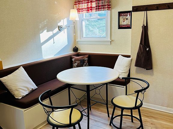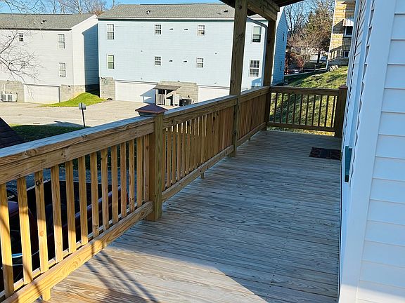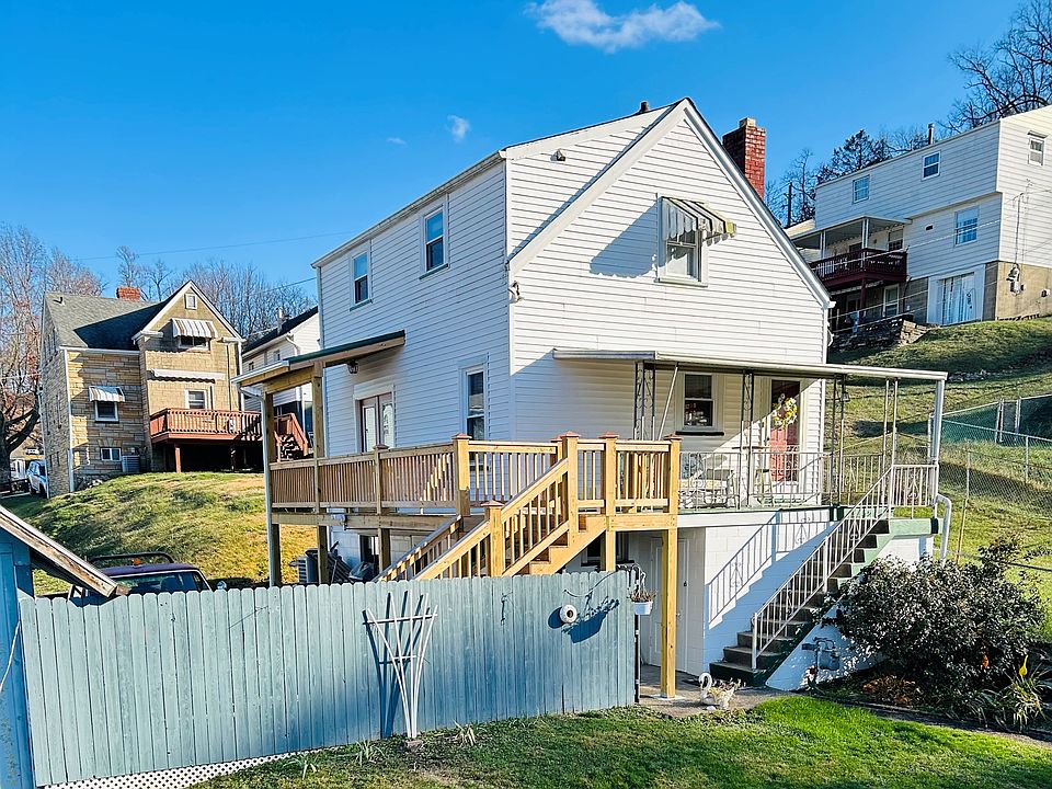 It is a house, located behind the landlord's house, with off street parking. It has an above ground basement with a bathroom and laundry area with a place for the washer and dryer. It has a full flight of steps to the first floor that includes a kitchen and an open living room, dining room area. It has a second floor that has two bedrooms, one large and one small with a large bathroom. It has a recently replaced whole house AC, as well as, a recently installed high efficiency gas furnace. Recent updates also include a new roof, a deck, new French doors, new flooring, new dishwasher, new bathroom vanity, and freshly painted throughout. Renter pays for utilities 1 year lease term