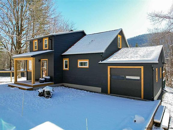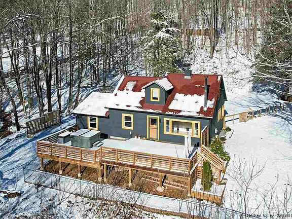 This fully renovated, streamside 3 BDR, 2 BA mid-century Cape is ideally situated on 2+ wooded acres with south-western mountain views & borders over 43 acres of forever-wild DEP land. -The exterior features a private driveway, attached garage, fenced-in grassy side yard (ideal for a swing set or pets), a fenced-in garden area with 8 raised beds, a separate fire-pit area, plus a large deck off the front of the home, complete with a 4-person hot tub perfect for viewing Catskill sunsets. -The home has been completely updated with many upgrades and conveniences: a new kitchen with stainless steel appliances, a bright living room with a JOTUL woodstove, NEST WiFi heating liaison, and hardwood floors throughout. The main level includes the kitchen, living room, 2 bedrooms and a bathroom. The second floor has a spacious bedroom with large closet, a full bathroom, entertainment area, plus lots of additional storage in the knee-walls. -The full basement includes laundry facilities & all utilities; high ceilings offer the potential to add another living space. -Walk to NYC bus stop, minutes to all Ski centers, Phoenicia, Peekamoose Restaurant, Phoenicia Diner, Urban Cowboy Lodge, Hiking, Pine Hill Lake and Beach and all services. Just 2 hours from the GWB.