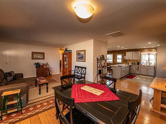 Backyard Fenced. Good floorplan and location for short term rental. Single level home on a short cul-de-sac. So many update changes to this home since it was built. The barn wood on the living room and den walls gives the home a warm comfortable feel especially sitting around the newer woodstove. Kitchen has granite counter on updated cabinets and backsplash. Almost new kitchen appliances. Bamboo, oak, carpet and tile flooring. The electric fireplace in the bedroom stays. The back porch was enlarged with railing for "cookout space" and just relaxing. Large storage shed. The backyard was fenced in 2022. Third bedroom is split from other bedrooms and could serve well as an office or playroom. The new gas furnace was added in 2022 with preparations for A/C addition. Even the gas hot water heater was new in 2022. Anderson windows throughout with new ones in the back bedroom and den. Circle drive around Aspen trees extends off street parking. Great buy per square foot!