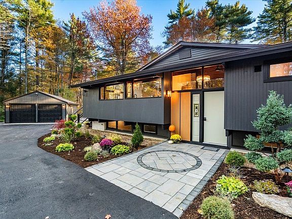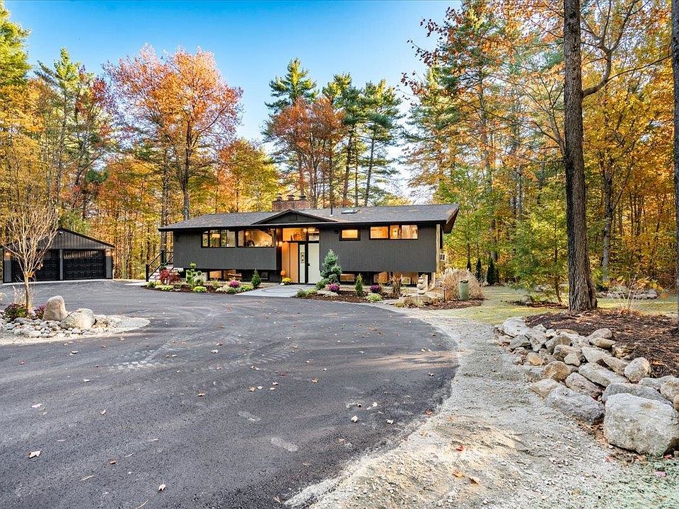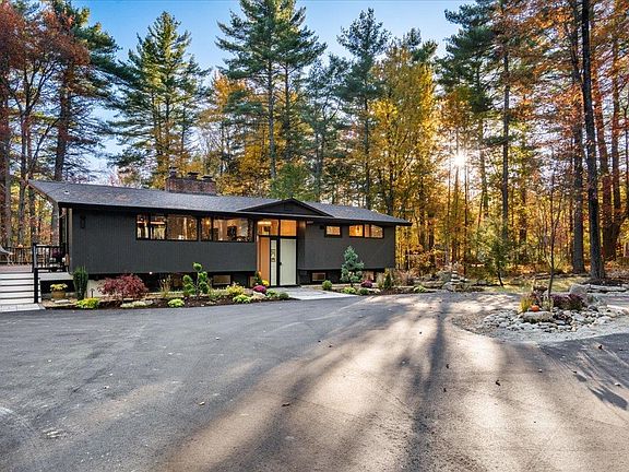 Sellers will continue to accept showing requests!! Set on over 11 private acres, this stunning Deck House–style home has been tastefully reimagined to preserve its original character while adding every modern comfort. Nearly everything is new — from the roof and heating system to the kitchen with stainless appliances, granite counters, and cabinetry. The list of improvements goes on and on, making this home truly move-in ready. At the heart of the home, a floor-to-ceiling fireplace anchors the open living space, framed by vaulted mahogany-beamed ceilings and walls of glass that bring the outdoors in. The first-floor primary suite feels like a retreat with a walk-in closet and brand-new ensuite bath. Downstairs, you’ll find a bonus room with another fireplace, two bedrooms, and a remodeled full bath. Outside, enjoy custom landscaping, accent lighting, and an expansive hardscape patio with a propane firepit that lights with the flip of a switch. A freshly paved driveway leads you home — and a private trail takes you to a nearby beaver pond. Imagine yourself gathered around the fire on a crisp autumn evening, where the outdoors are every bit as inviting as the indoors. This one is truly something special.