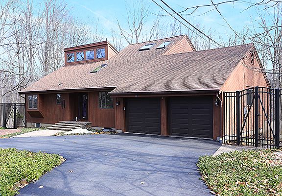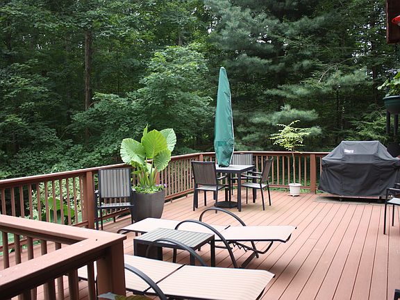 Nature's playground! Custom built 3BR 3BA Contemporary home features extensive lush landscaping, including in-ground gunite, heated pool, Koi pond, lovely plantings, circular drive & stone walkways. Warm & inviting w/ 2-story ceilings, skylights, custom wood built-ins & charming stone FPL w/ wood-burning stove! Relax w/ morning coffee in sunroom overlooking beautiful property. Desired open concept - great room to dining area to kitchen! Custom cabinetry, center island, high-end appliances! Slider to large maintenance-free deck. HW flrs thru-out! Main level has 2BD & full BA. MBR suite upstairs w/ vaulted ceiling & full BA. Finished walk out bsmt w/ gas FPL in rec rm, full BA, wet bar, exercise rm, storage. Possible in-law suite in LL. Andersen window. 2 car garage. Peaceful oasis to relax, entertain & enjoy!
