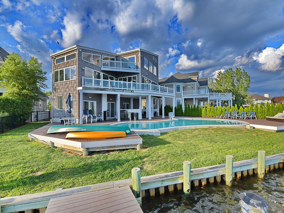 PANORAMIC OPEN WATER VIEWS ABOUND! This peninsula-style lot has nearly 90 ft of water frontage & Riparian Rights. Cherry Quay home with contemporary flair has been raised and completely renovated. This 3BR/3BA with open concept living & wall to wall windows is perfect for entertaining and taking in the dynamic scenery! Features include custom white cabinets with gorgeous reclaimed wood counter tops, breakfast counter & wet bar. Living & Dining Rooms have double sliders leading out to balcony with composite decking & vinyl railings. MB has ensuite, WIC w/built-ins & large balcony. Beautiful built-in heated pool is surrounded by composite decking and outdoor covered lounge area. Newer pier dock has boat lift & 2 jet ski lifts. Vinyl Bulkhead. All that waterfront living offers and more!