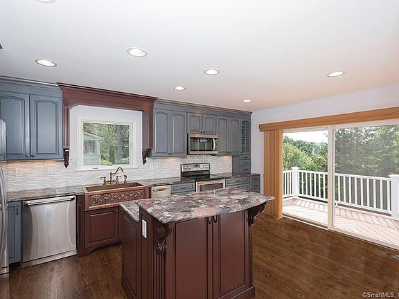 Contemporary colonial in desirable Candlewood Shores. Home was completely re-built in 2009 and features custom details and design throughout. Beautiful, level lot is nicely landscaped and has a private back yard. The over-sized deck and upper balconies offer year-round views of the lake. A double sided fireplace separates the living and dining area, and there's a truly spacious chef's kitchen complete with custom copper sink and newer stainless steel appliances. All 4 baths include high-end kohler fixtures and vanities. The lovely master bedroom has a large bathroom, spacious walk-in-closet and it's own balcony... perfect for watching Westerly sunsets over Candlewood Lake. Recently re-finished hardwood floors add warmth and character throughout. There's plenty of additional space in the finished lower level which opens onto the patio and back yard area. The front yard features custom concrete and stone work which adds curb appeal. Home has 2 bonus rooms on the main floor; one or both can double as additional bedrooms if needed. High end ADT security system and whole house intercom installed. Candlewood Shores offers a beautiful sandy beach, clubhouse, tot-lot and sport courts.