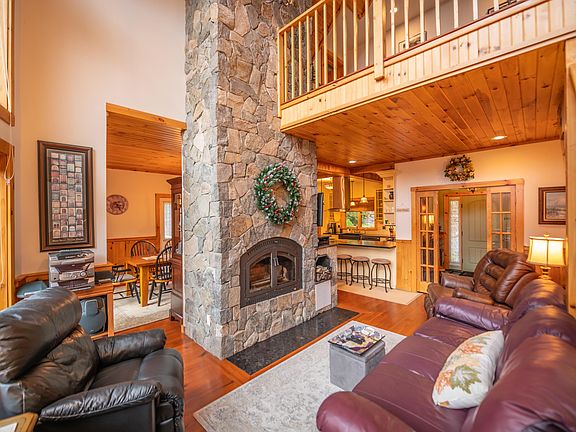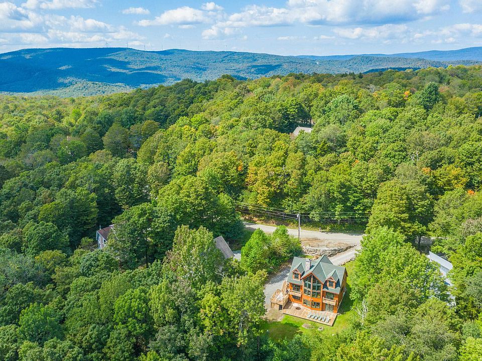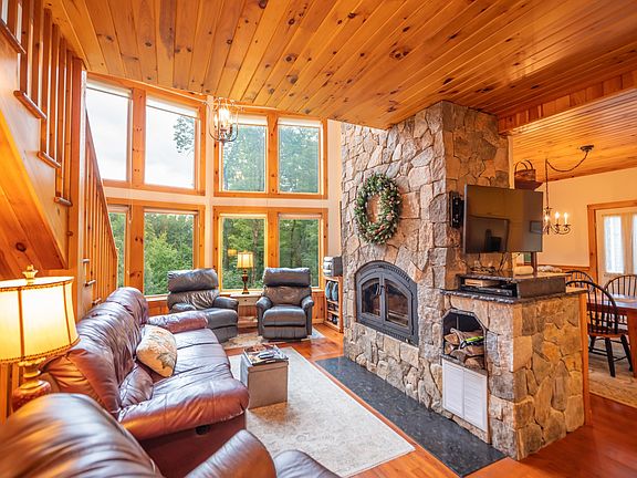 Stunning 2007 custom home in the Chimney Hill community just a short drive from the Mount Snow Ski Resort and village Wilmington. This meticulous turn key home has amazing curb appeal, and sits on a on a private lot in the Chimney Hill community on a quiet side road with access to snowmobile trails. There are extensive stone walls and a stone path leading to the timber front porch. Inside is a gorgeous great room space with vaulted ceilings and exposed natural woodwork, great natural light thanks to large windows with a Vermonty rustic feel, wood floors throughout, a fireplace with floor to ceiling stone chimney, and exposed beams, upscale kitchen with custom cabinets, stainless appliances, and soapstone counters, a main floor primary suite with full bath and tiled shower, 2 upstairs bedrooms en suite, and a loft looking out the vaulted windows to the winter view, a full finished walkout lower level family room, laundry room, a fourth bedroom with en suite bath, and access to the rear, as well as a main floor large mudroom with half guest bath. There is a garage. radiant and forced air heat already prepped for ac, a spacious double deck for entertaining with wet bar, fire pit, and ample parking. This includes the amazing Chimney Hill amenities of indoor and outdoor pools, clubhouse, theater, gym, hot tub, basketball court, tennis courts, winter ice skating, and a la carte services like plowing and trash, to afford yourself plenty of downtime, not upkeep.