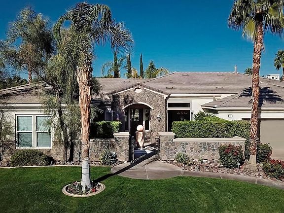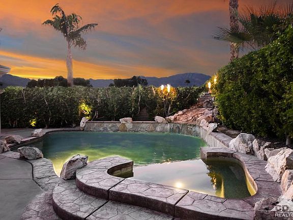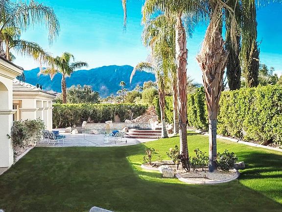 A MUST SEE! Newly updated, pristine and stunning! LOWEST price in prestigious La Toscana! Dramatic orange sunsets, mountain views & gas fired tiki torch lamps set the perfect backdrop to this large, private, lush and entertaining backyard with custom rock waterfall that cascades into the sparking blue pool. A raised spa offers yet another water feature w/rock spillway. Tranquil & private or fun & entertaining! Large sun deck, 3 covered patios, outdoor shower & built in BBQ island! The ultimate in indoor/outdoor living! Indoors is just as dramatic w/high ceilings, large great room open to the kitchen, plus living room & formal dining. 3 Br plus office includes detached casita, the huge master retreat has large sitting area aside another fireplace! 3 car garage on a large corner lot, with even more water features gracing the front entry and casita that has its own private entrance. Perfect full time playground or winter retreat-close to everything you love in the Palm Springs Valley!