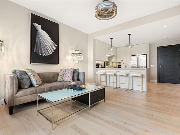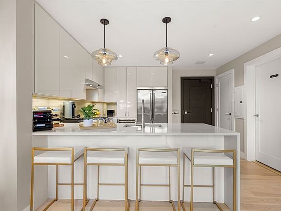 SUMMER POOL PASS GIFTED TO BUYERS! Residence 412 is the most desirable 1 bedroom layout at Sepia - a full-service luxury building in the South End. This home offers an inviting open-concept configuration with floor-to-ceiling windows and private balcony. Upon entering, you're greeted by high ceilings and abundant natural light showcasing the effortless flow of the living spaces. The gourmet kitchen is the heart of the home with ample cabinetry, stainless steel appliances, gas stove, and Quartz countertops. The peninsula with waterfall edge and pendant lighting is ideal for dining and entertaining. The generous living room opens to the exclusive balcony. The large bedroom features floor-to-ceiling windows and 2 elegant chandeliers leading to the walk-in closet. Pocket doors provide ensuite access to the tiled full bath with glass shower and floating vanity plus a 2nd door opening to the main living area. Additional features include in-unit laundry, AC, & dedicated leased garage parking.