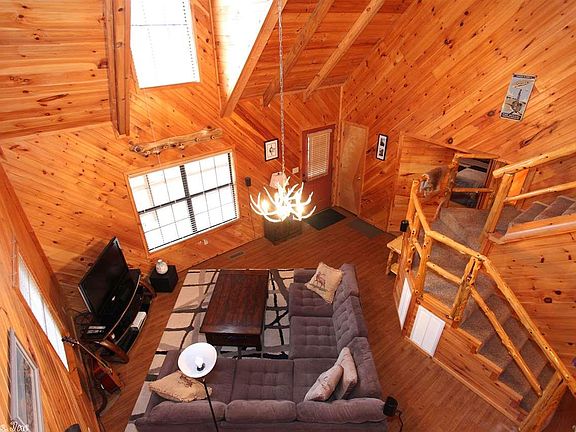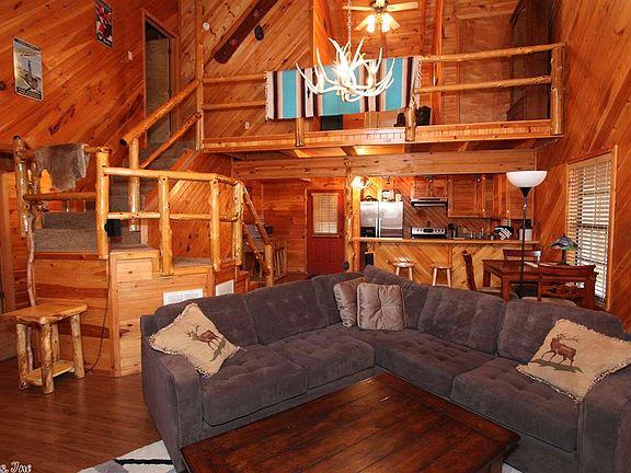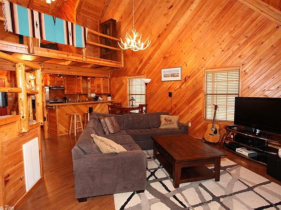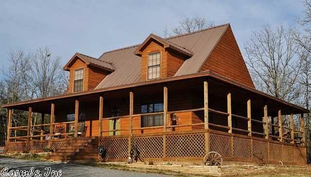 Beautiful log cabin style home that sits on an acre w/a wrap-around covered porch, vaulted ceilings, tree branch rails, metal roof as well as an outdoor balcony off the master bedroom. Bonus room and balcony overlooks the living room. Wooden walls and ceilings. Very rustic look. Detached 30 x 30 metal shop w/2 overhead doors & concrete floor. Large circle drive.