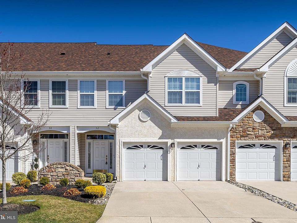 It will be a joy to call 32 Tudor Court home! Located on a quiet cul-de-sac in the Marlton Woods neighborhood, this 2-story townhome is a short stroll or drive to the Marlton Crossing shops where you will find popular eateries, shops and services. Also super close is Trader Joes, Promenade at Sagemore, Sprouts, Duck Donuts, and Chickie & Petes, Zed's brewery just to name a few. The location is amazing! This home features lovely exterior curb appeal that opens to a gorgeous interior offering high ceilings with lots of natural sunlight streaming through. Clean, contemporary colors feel fresh and current and blend beautifully with the fabulous hardwood floors that flow throughout the open main level. The living room has recessed lighting and a cozy fireplace. A nice sized dining room is perfect for hosting holidays or any size group. The kitchen has lovely maple cabinetry, tons of storage and prep space, and a separate breakfast area ready to enjoy quick meals or your morning coffee. A nicely updated half bath is conveniently on the main level. Upstairs the primary suite has a dedicated spacious primary bath with dual sink vanity, a rejuvenating soaking tub, large stall shower plus a walk in closet. Two additional bedrooms are both generously sized and share a nicely maintained full bath, and you will love the handy 2nd floor laundry. A large paver patio off the back offers privacy and provides a quiet tranquility. This property comes with a 2 car garage, perfect for all your storage needs, plus a large driveway so parking is never a concern. The heat and air was replaced in 2020 and the hot water tank in 2017. Enjoy easy access to all the major commuting routes, including Rte 295, 73, 38, 70, and the NJ Turnpike. Embrace an exciting new lifestyle where everything is minutes away in a beautiful and well maintained community!