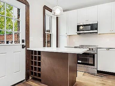 Newly renovated 3rd floor, sun drenched apartment features a bright eat in kitchen with Blumburg stainless steel appliances, spacious Quartz countertops/backsplash, eat in'' peninsula with wine rack, garbage drawer & storage. Brushed gold faucet & fixtures are the perfect accent to the Apron sink & 100% Solid Wood Shaker style cabinets with under-counter kitchen lighting. Located conveniently off the kitchen, is a private 3ft x 5ft wrought iron lighted balcony, perfect for relaxing day or night. As you move from room to room, you will find Mitsubishi Slim split units located in the ceilings that provide heat & AC for the right climate during any time of the year as well as wood accent ceiling fans. Enjoy doing your laundry in the comfort of your home with the Fisher & Payless Ventless Front Loading Washer & Dryer and storage area. As you head over to the spacious bathroom, heated bathroom floors w separate thermostat, Stand in Glass enclosure shower, and an Anti Fog LED Touch Mirror grace the room. The perfect combination of new & original, Unit 303 boasts 9 foot closet doors along with the most beautiful reclaimed original 1870s wood mouldings and flooring throughout. Some additional added conveniences include USB ports & Coax cables located throughout; LED dimmable high hat lighting,