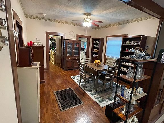 Enjoy your coffee on this quiet front porch. Beautiful hardwood floors and high ceilings lots of big windows, and natural light enhances the spacious welcoming feeling, very well kept home. Includes a bonus room in the back that that could be used as a 3rd bedroom which does include a closet. Maintenance free metal roof, and vinyl siding. Spacious fenced in back yard and a detached one car garage. Includes a storm cellar.