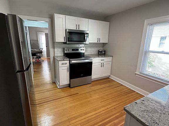 $2700/Month - HEAT INCLUDED IN RENT. Grass/Snow maintenance handled by landlord. Spacious and fully renovated, this 3-bedroom, 1-bathroom apartment offers modern living with thoughtful upgrades throughout. The kitchen and bathroom have been completely remodeled with brand-new appliances and fixtures, and the entire unit has been freshly painted. You'll find hardwood floors throughout, new LED lighting, and updated door hardware throughout the space. Enjoy the convenience of off-street parking for two cars, along with an on-site EV charger. The large, fenced-in backyard features a small rock patio perfect for outdoor relaxation, grilling or entertaining. Additional improvements include a newly redone driveway, Roof, and Common area's making this move-in ready home as functional as it is stylish. Available Now