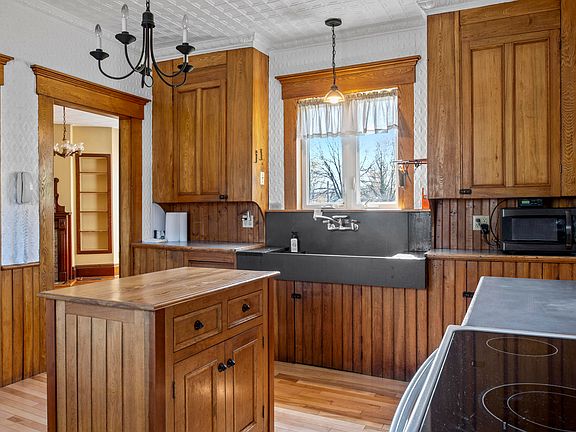 Beautiful New England farmhouse with classic original woodwork, hardwood floors. fireplace,, high ceilings, lovely, original kitchen with wainscot cupboards and slate sink. Also formal diningroom, livingroom, parlor, front hallway, with all natural woodwork and hardwood pocket doors, Beautful staircase. Four bedrooms, two full baths, attached barn with ample storage and workshop. Very nice open wrap-around porch .Elevated lot with paved driveway, well-tended flower beds. MOTIVATED SELLER !!!!!this home is very unique and charming.