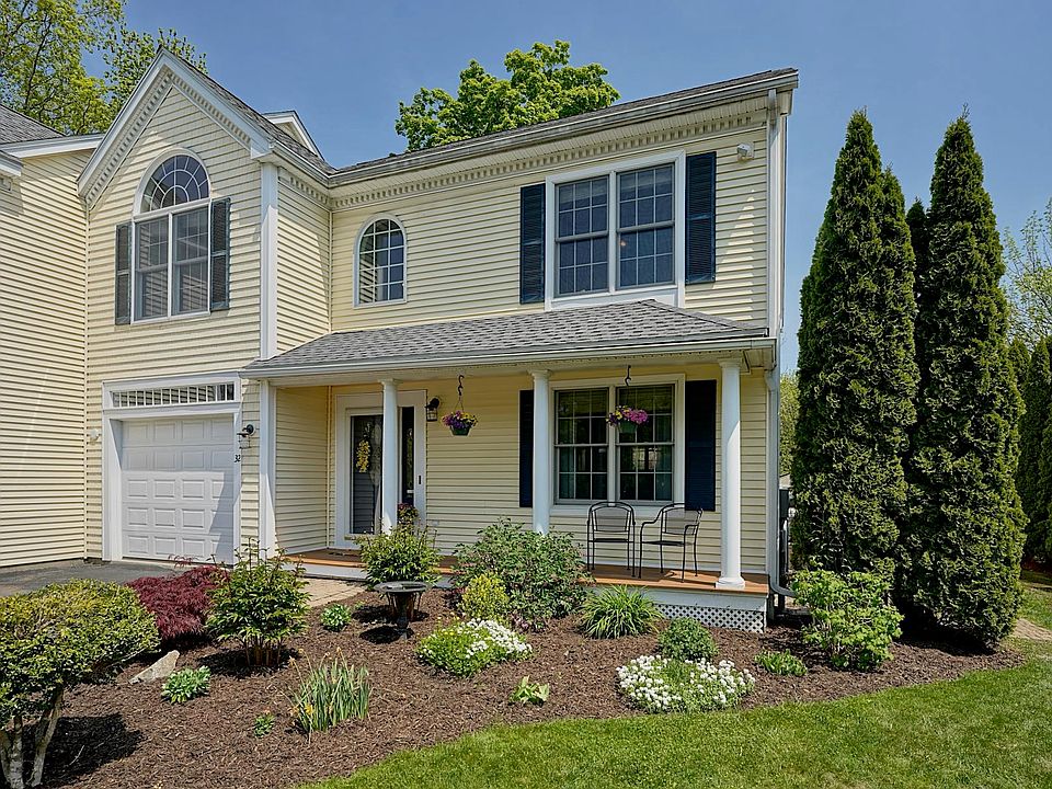 So many fabulous details inside & out of this spacious 3-4 bedroom, 3 full bath condex. The stunning Chef's Kitchen will WOW you to no end! Center island equipped with prep sink & seating. Side cabinetry with sink and beautiful glass cabinets makes the perfect coffee or wine bar. Granite counters & backsplash, farmer's sink, gas cooktop, electric double wall ovens, under cabinet lighting, upgraded cabinetry and slider to the outside oasis. Open concept Dining and Living Room with crown molding & cozy gas fireplace. First floor bedroom with pretty inlaid floor is currently used as a den. Full bathroom on the first floor. Wood staircase leads to the 2nd floor landing with convenient & adorable laundry closet (cabinet doesn't stay). Dreamy Primary Bedroom Suite has French doors to balcony overlooking pretty backyard & conservation land beyond, vaulted ceiling, walk-in closet, French doors to large tiled bathroom offering relaxing jetted tub with chandelier above and furniture quality double vanity. 2nd Bedroom has attractive palladian window and built-in IKEA headboard, handy workstation and closet organizer. 3rd bedroom is also cheerful with double closets. Full basement has storage & shelving, 1 car attached garage, central AC, public water & sewer, natural gas, vinyl exterior & composite decking, new roof. Lovely plantings & front covered porch greet you. Backyard is awesome! Large deck, patio, Wisteria covered pergola, mature arborvitaes, shed & more!! Great location!!