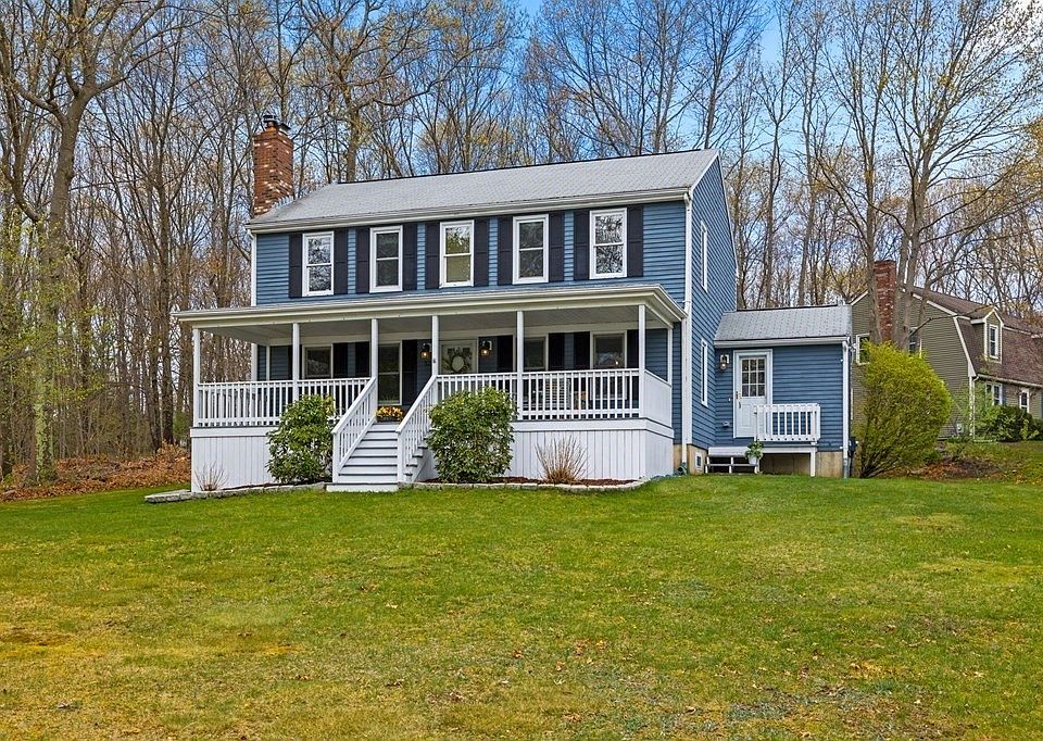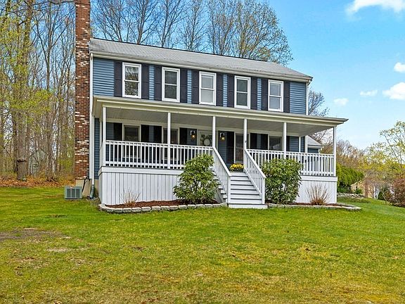 EASTLEIGH ESTATES - Colonial w/Farmer's Porch on pretty corner lot in established E. Mansfield neighborhood! Easy access to shopping, all major routes, schools, Flint Farm + more. Main floor boasts formal DR, fireplaced LR, first floor laundry in powder room, & open eat-in kitchen/family room w/glass doors to back deck. 3 generously-sized beds upstairs, including main bedroom w/2 walk-in closets. Oversized full bath in hallway + 2nd closet present unique opportunity to create 2nd full bath upstairs to complete a primary suite. Finished basement w/office space and bonus room (pool table included!). 320 sq ft expansive front porch serves as incredible outdoor living room to enjoy beautiful sunrises and neighborhood get-togethers. Fresh paint, glossy hardwoods, new carpets, + plentiful storage throughout. Kitchen features recently replaced stainless steel appliances. Central air, town water, septic passed Title V. Showings start Thurs 4/27 and go all weekend w/OH Thurs + Sun. Don't wait!