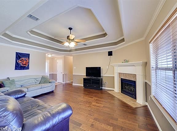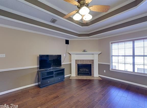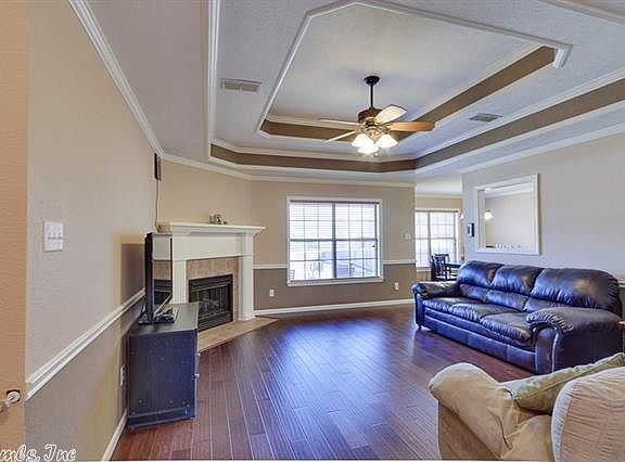 Brand new hand carved hardwood flooring in living area and hallway! Double tray ceiling in living area with crown accents. 4 bedroom home with corner fireplace. HUGE fenced back yard. Quiet culdesac. Refrigerater stays, too!