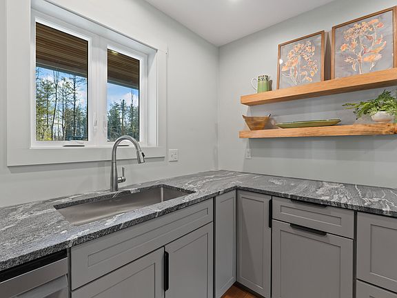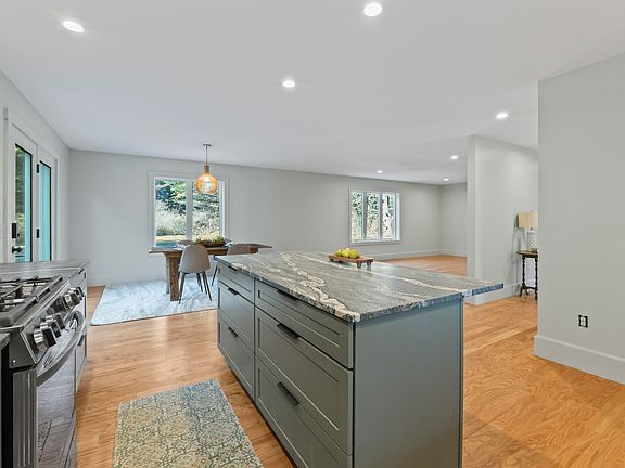 The new home features an open kitchen, dining and living room, and a first-floor primary suite. The warm spaces are dressed in contemporary finishes like leathered granite, radiant heated oak flooring, and modern, clean trim work.