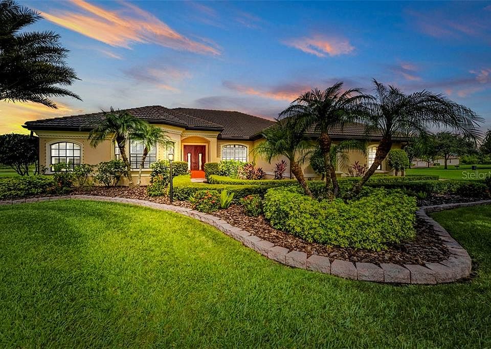 Sprawling over 3,300 square feet on a corner, lakefront property with panoramic preserve view, this immaculate home is an astounding example of casual, elegant Florida living. Perfectly fitting your family's every need, relish in the abundance of space, comfortable domains, and the enjoyment of indoor-outdoor entertainment. Impressive double doors welcome you inside to a flowing layout that connects the living room to the family room while glass sliders offer accessibility to the lanai from both rooms. The inspired host will appreciate effortless entertaining year-round with spreads made in the outdoor kitchen with mini-fridge, sink and Jenn-Aire grill, or gourmet feasts cultivated in the grand kitchen featuring rich wood cabinetry, solid-surface countertops, breakfast bar, stainless appliances and butler's pantry connecting to the formal dining room. Find solitude in the den/office and enjoy family movie nights in the gracious fifth bedroom with surround sound that can be easily converted to a media room. Appreciate the sunshine, breezes from the lake, and seclusion of the preserve as you lounge in the resort-style, three-level pool with spa, water fountain, waterfall, jets, and lush landscaping with surrounding paver brick. Luxurious design aesthetics embellish the home, including crown molding; closets with built-ins; plantation shutters on many windows; tile, hardwood, and bamboo flooring; remarkable curb appeal with landscaping and accent lighting and black aluminum fencing in the backyard. Several assurances have been completed to bring peace of mind, such as the attic flooring; two recently updated HVAC systems, hurricane shutters, barrel tile roof, full gutter system, 2019 repainted exterior, and a built-in workshop in the garage. Life doesn't get any better than this serene, tranquil home in Country Meadows.