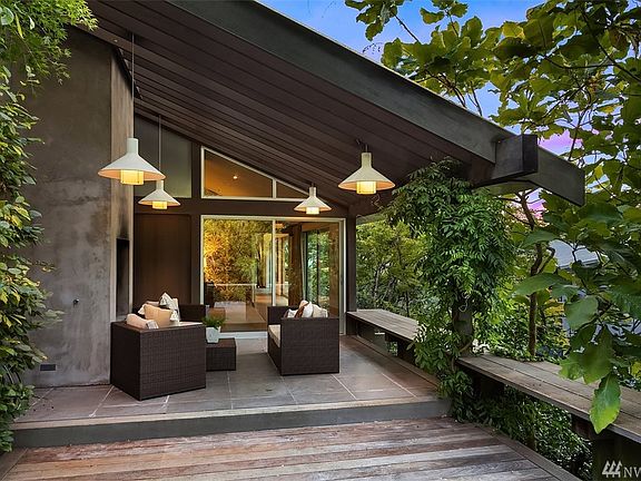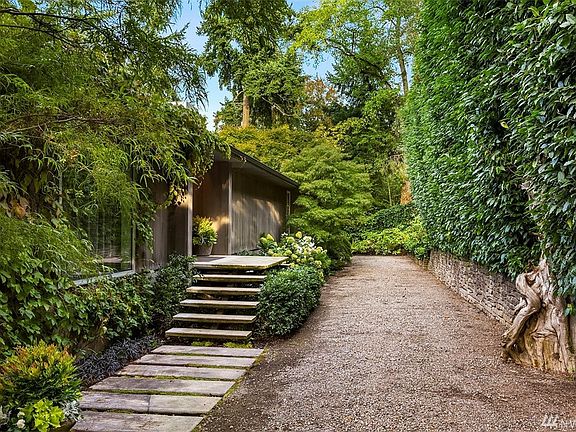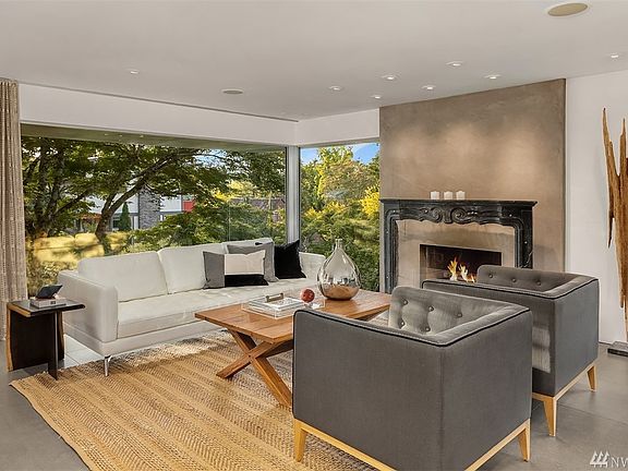 Living Modern in Denny Blaine...A designer's interpretation of a mid-century treehouse is masterfully executed. Minimalist design and decorative elements create a high style canvas for your treasures. An antique floating marble fireplace juxtaposes with a concrete and steel floating staircase. Walls of Fleetwood windows bring in territorial views of a verdant landscape. Steel accents, concrete floors, an artistic concrete wall. Rift cut oak cabinets & shelves, Calcutta Carrara kitchen counters.