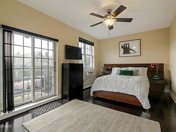 All showings by APPT only. Contact Corcoran listing agent to schedule. Spacious, sun-filled TOP FLOOR corner unit 2Bed/2Bath condo in prime Bay Ridge with PARKING, PRIVATE ENTRANCE, 2 BALCONIES, WASHER/DRYER, plus a PRIVATE STORAGE ROOM (9' x 5' feet) in the basement. This contemporary condo has excellent natural light with Southern, Western, and Eastern tree-top & sky views. The open floor plan showcases a modern kitchen with GE stainless steel appliances (including dishwasher & microwave), caesarstone countertops, and abundant cabinets & storage space. The king-sized master bedroom has excellent light with french sliding doors leading to a BALCONY, as well as, an EN-SUITE BATH with a large walk-in shower and seamless glass doors. The second bedroom is also spacious and has an extra large closet and window. Other features include: hardwood oak floors throughout, a WOOD BURNING FIREPLACE, in-wall AC UNITS, surround sound, and an ADT security system. Renter pays all utilities and broker fee. Sorry, no pets. Proof of solid finances required. Ideally located close to shops & restaurants on 3rd Avenue and just a few short blocks from R subway stop at 77th St. Express buses and NYC ferry are also nearby. THIS CONDO HAS IT ALL... contact the listing agent to schedule a showing!