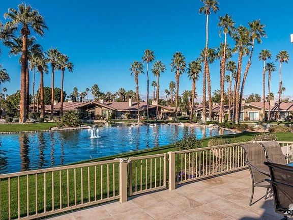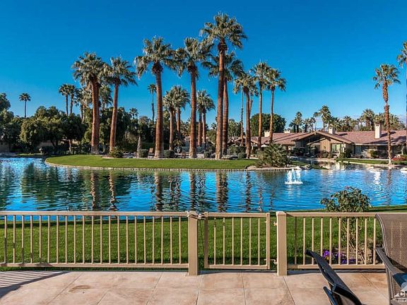 The stunning remodel of this customized Abilene is second only to its ideal location. Perfectly situated lakeside with relaxing views of the palm tree covered island and community pool. The expanded back deck, tiled and complete w/a built-in barbecue, offers both sun and shade and is perfect for enjoying the desert's stunning blue skies. Inside, slab granite countertops, newer stainless appliances, gas stove top, custom cabinetry, and newer lighting create a one of a kind kitchen. The wall between the kitchen and living rm has been replaced with granite countertops and countertop seating to create a custom, open floor plan. Both bathrooms have been beautifully remodeled. Travertine flooring & newly painted thru-out. Direct garage access. Located on a quiet, interior cul-de-sac; close to 2 community pools. The Lakes CC offers 27 holes of private golf (membership req'd), active clubhouse, bocci ball, tennis, pickle ball, and fitness facility. Retail & restaurants w/in walking distance.