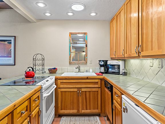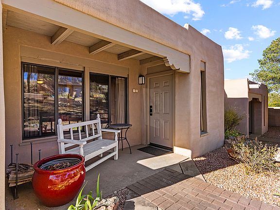 This welcoming one bedroom, one bathroom condo at the Fort Marcy Compound is just 6 blocks from the downtown plaza, and 1 block off Artist/Hyde Park road to 10,000 Waves, hiking & biking trails, and Ski Santa Fe. The pleasant interior is nicely updated, to include a washer/dryer, double sink vanity, and walk-in shower. The kitchen is open and roomy, and the wood-burning stove in the living room will keep you and your guests toasty all winter long! This end unit has no steps to access from parking, and features more windows than others, giving the interior a nice, cheery feel. New roof and HVAC system in 2024. This condo has been enjoyed by the same owner for 22 years over every season, with the east-facing porch cool for summer evenings, and walking a short distance up the hill to catch the sunset and expansive views. Although within walking distance to the downtown area, this condo provides a cozy, quiet retreat. Fort Marcy is a unique property with condos sited over 10 acres, and much of the site left in a natural state, some areas much like a small forest, right in town! This is truly a lock and leave, or can be used for short-term rentals. Full furniture [package conveys with sale at zero dollars. All contents included. Professional management company on-site offers a rental program, and manages the physical plant. Google All Seasons Resort Lodging for more information.