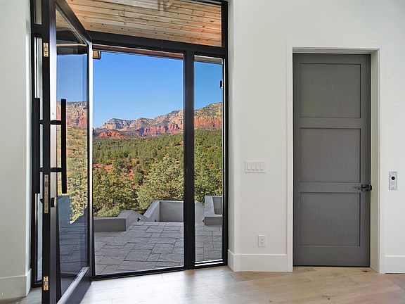 Modern contemporary home with exquisite views of the Sedona redrocks, in central location close to shops and trail to famous Vortex. Home is well thought out, no detail has been left out and built with exquisite finishes. Every room has views to the redrocks and privacy from other rooms. Steel frame was used in the living room to create a wide span that once you open the slide doors the entire living room is connected to the balcony. Architectural elements, skylights, upper windows and lines decorate the vaulted ceiling in the common areas. The master suite in the upper level has an extra-large walk-in closet and 'bath-with-a-view'. Two other bedrooms each with private bath are on same level. There is an elevator and stairs connecting all levels. There is a family room with gas fireplace