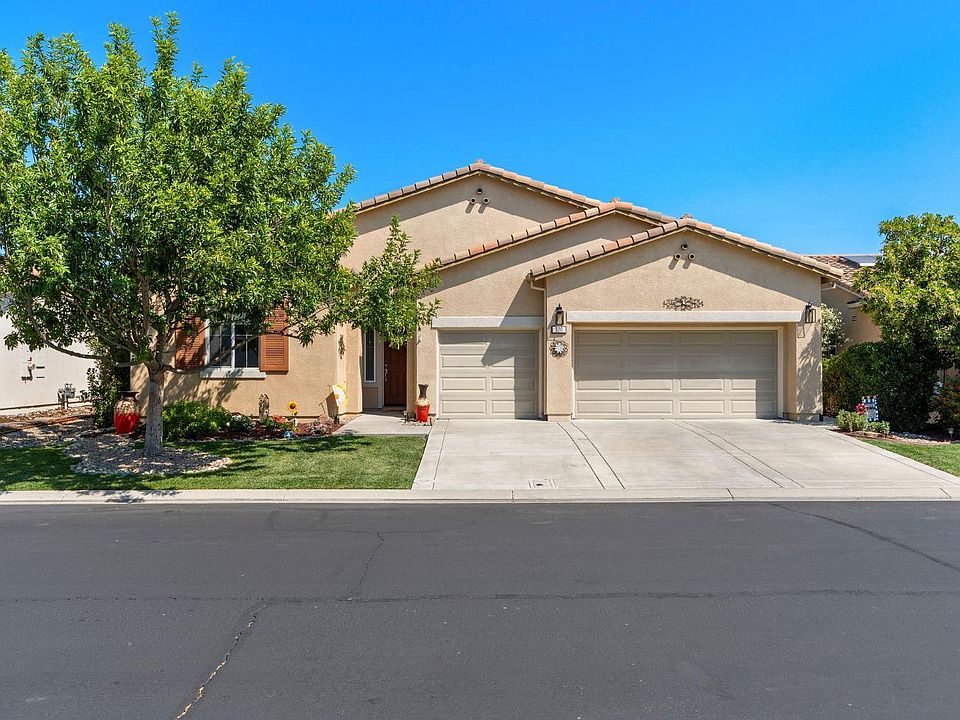 Popular Verano Floor Plan with SOLAR, 2 bedrooms, 2.5 baths, plus den/office and 3 car garage. Beautiful plank tile floors throughout most of the home, spacious primary and guest suites, ceiling fans, and white cabinets are just of the few wonderful interior appointments. The beautiful kitchen features granite countertops, a large central island with built-in breakfast table, and sleek stainless appliances including gas cooktop and refrigerator. The den/office boasts privacy doors, and the laundry room includes a large pantry closet as well as cabinets above the included washer and dryer. Also included are water treatment and fire suppression systems. Outside, you'll enjoy a lovely covered patio and delightful landscaping. Life in Trilogy offers access to abundant amenities, including an 18-hole golf course, resort-style clubhouse, fitness center, indoor and outdoor pools, tennis, pickleball, a full-service spa, bocce ball, clubs, events, and activities for every interest. Enjoy the Trilogy lifestyle while living your best life in this fabulous cheerful home. Trilogy is a 55+ community.