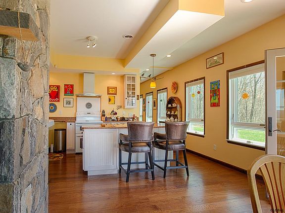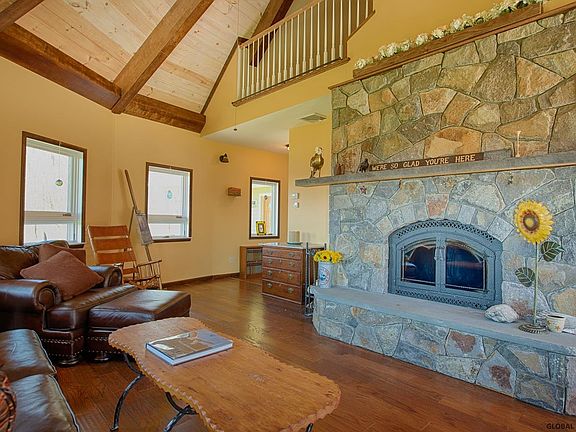 Custom built home very privately sited on 40 acres of fields and woods. Many maple trees and the property includes a fully functional sugar house - make your own maple syrup! Great property for horses with pasture, fields and LOTS of trails in the area. Home is set back from the road giving a truly private situation. This uniquely designed home has a semi circular floorpan to optimize the setting. Huge stone fireplace is a focal point of the main living area with a cathedral ceiling clad in beautiful hardwood with beams making a cozy gathering place in all seasons. French doors open out to a deck with views of mountains and fields. HUGE upper level currently has one bedroom and there's room for a wonderful master suite or several additional bedrooms. Virtual Tour available.