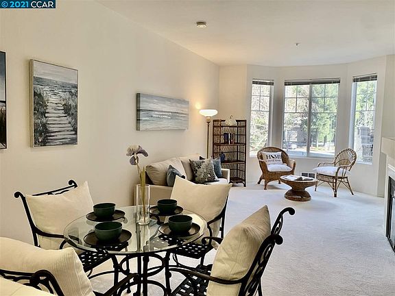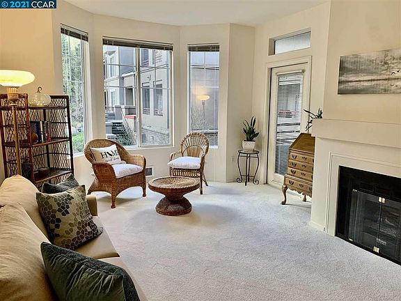 Nestled in the Oakland Hills this lovely 1 bed, 1 bath end unit condo is located in the gated community of Parkwoods. This light & bright condo has been recently painted & newly installed stain resistant carpet. A gas fireplace in the living room for those cozy evenings. The kitchen w/ microwave, tile countertops, gas range, & breakfast bar that looks out to your living room & bay window w/ views of the hills & trees. The bedroom has an excellent size walk in closet w/ a glass sliding door to the patio/balcony. Extra storage is available on the patio. In unit energy efficient washer & dryer. The spacious bath has shower over tub. Lots of amenities including, swimming pool, spa, sauna, gym with lots of equipment & community room. Ample grounds for the avid walker. Dog friendly. Easy access to BART, shopping, freeway, biking, & hiking. High speed wifi available. Garage parking close to the lobby entrance w/ 1 deeded space. Dues in the complex were raised as of 1/1/21.