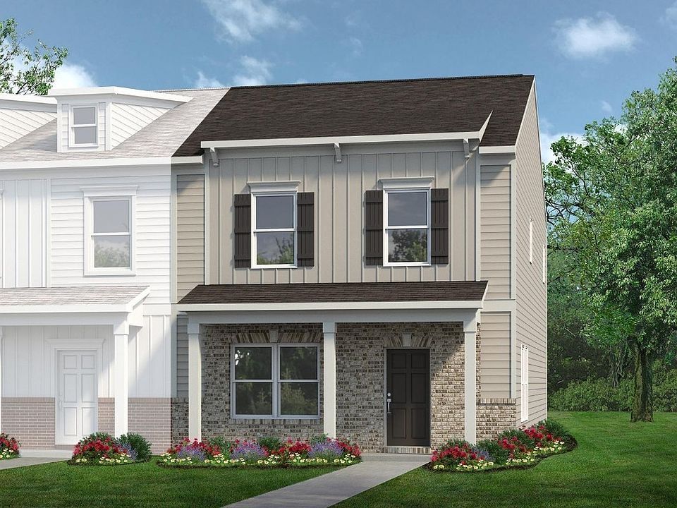 The Sussex by Smith Douglas Homes at Stratford Towns is a modern living spacious townhome. The two-car rear garage leads to a kitchen with a large center island. The cozy dining area is open to the kitchen and family room, with a convenient exit to the expansive front porch. Upstairs, the owner's suite features a spacious walk-in closet and a separate water closet. Two bedrooms, a full hall bath, and a second-floor laundry room provide convenience for household chores.