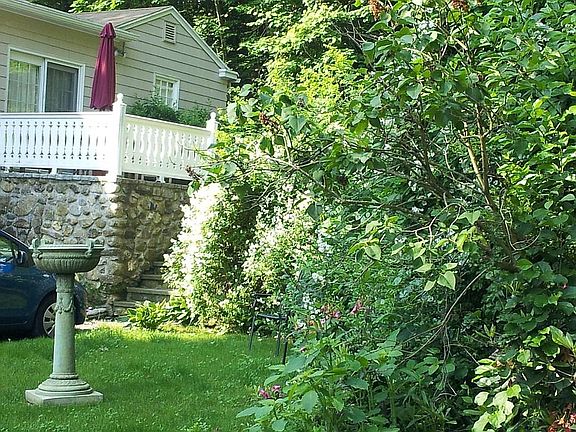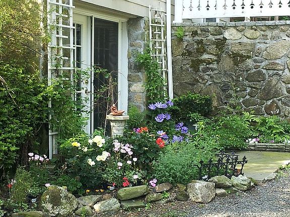 Cottage style ranch, hardwood throughout living space. Slate garden room with French doors out to a multi-level patio and garden. Quiet surrounded by conservation lands on two sides. Private back yard. Fieldstone rock walls.