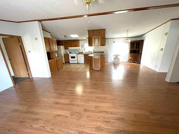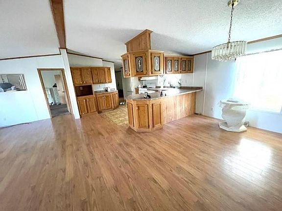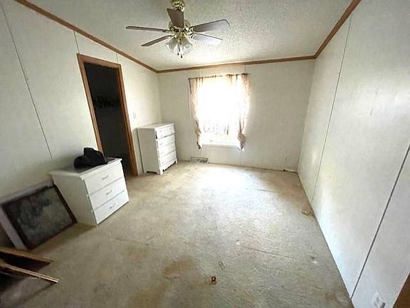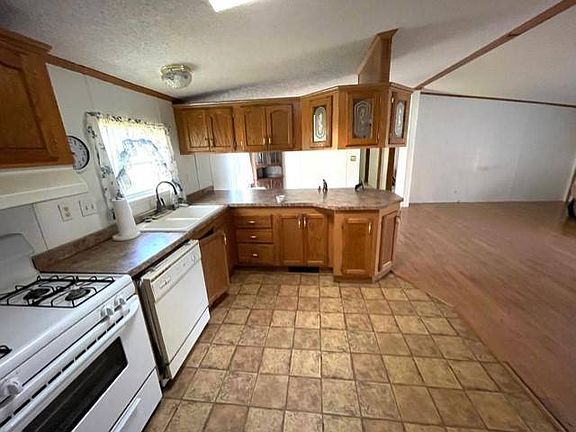 Sun Porch: Glassed in porch with cement floor. Great for morning coffee. Entrance: Laundry area, plus door opens to a bath that is off master bedroom. New laminate that isn't yet installed. Kitchen: LOTS of cabinets and octagon shape bar divides dining area from kitchen. Stove and refrigerator included. Dining Area: Continuous decor as living room. Bath: White fixtures, skylight, vinyl floor. Bedroom: Carpet, walltex walls, carpet, huge walk in closet. Bedroom: Carpet, walltex walls, carpet, huge walk in closet. Master Bedroom: Large, has walltex walls, carpet, nice closet, bath with a garden tub. Shower and vanity, opens to laundry area. Separate garage could use some repair.