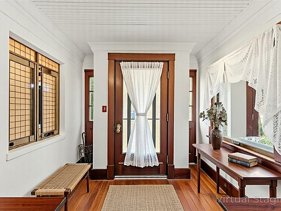 Rich original woodworkNewer metal roofAdjoining sun porchImpressive soaking tubSpacious updated bathroomUnique ceiling designHigh ceilings