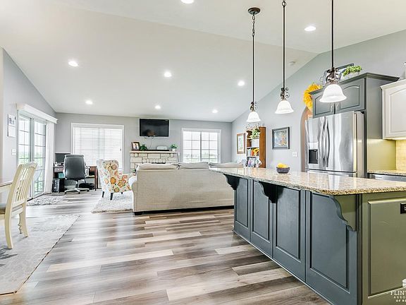 WELCOME HOME to this immaculately maintained and cared for ranch-style home perched on a sprawling half-acre lot in the hills of Manhattan's BELOVED west side! Just at ten years old, this spacious, open-concept ranch comes packed with modern features and accents - vaulted and trayed ceilings, granite countertops, cozy stone fireplace in the family room, double-vanities, and double shower in the master bathroom, insulated 3-car garage, covered deck with composite decking, hot water recirculation system and tons more. Basement boasts a spacious family room with a custom built-in wet bar, FEMA rated safe room, ample basement storage, and a walkout that welcomes you to a thoughtfully crafted hardscaped patio with integrated firepit. Property is cost effective w/ BRAND NEW upgraded class-4 impact-resistant roof (July), new exterior paint, deck stain, and more. Call Clay Graber with Foundation Realty today at 7852209030 and come make this dream house on Manhattan's west side, your HOME.