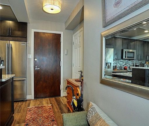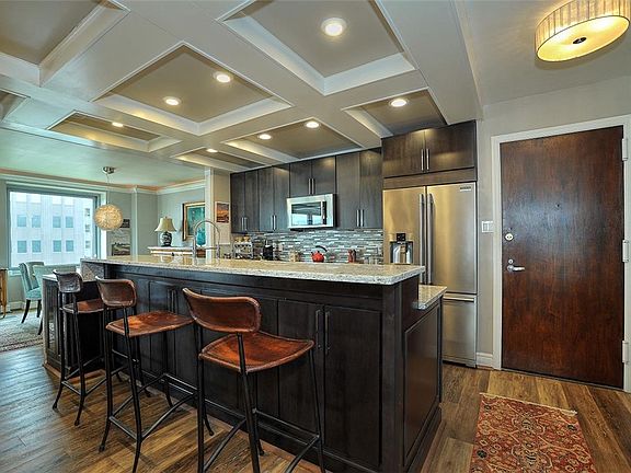 Corner condoAbundance of custom cabinetsQuartz island and countertopsGlass tile backsplashUnder-the-cabinet lightingLarge primary bedroomMarble master bathroom