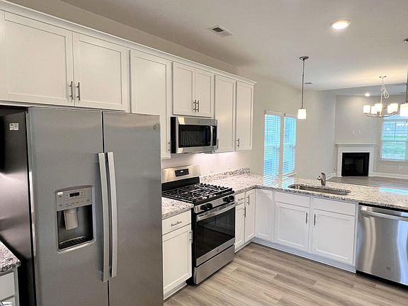 This home has a walk up self-tour option! California Chic at its finest! This stunning Princeton plan by Cothran Homes is designed with you in mind. Our California inspired Monterey custom curated design incorporates all the right elements of California Cool in this lovely home. A first-floor vaulted ceiling owner’s bedroom with luxury en-suite that includes, York Drift stained double Kohler sink vanity, Shaw Origins Aurora vinyl floors, full walk-in-shower and joining large walk-in closet. A spacious living room complete with Minka ceiling fan that flows effortlessly into dining and kitchen area for those who love to cook and entertain at the same time. Fulton Sugar white cabinets, Biscotti White granite countertops, matt black modern cabinet hardware, under cabinet lighting and walk-in pantry make this a dream kitchen. GE Stainless appliances including gas range, microwave, dishwasher and refrigerator. This 3 bedroom, 2 ½ bath includes 5” wide Polaris Lighthouse luxury vinyl plank flooring throughout first floor main living areas and Shaw Midway Plaza Pebble Creek carpet with 8lb pad in bedrooms and second floor. Laundry room includes Washer/ Dryer hookup and shelving for all your laundry accessories. Work from home or always wanted a TV den, the second-floor loft will be the perfect space to set up both. Installed 2” faux white blinds, first floor laundry room and private rear porch…. who could ask for anything more!
