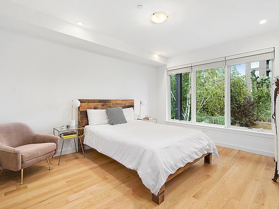 Large & pristine 3-bedroom home in the heart of East Williamsburg. This bright & beautiful 3-bedroom, 2-bathroom home was completed in 2018 as part of a very well-located boutique condo. A gracious west-facing living room and dining area combine with the open-plan kitchen to create a dramatic great room. The kitchen features a suite of stainless steel appliances, including a built-in Bosch microwave and a full-sized dishwasher, accentuated by light solid-surface countertops and darker cabinetry that provide a contemporary look with a warmth that is right at home in Brooklyn. With high ceilings and beautiful hardwood floors throughout, the entire apartment exudes a comfort and quality rare in new buildings. The generous master bedroom with its picture window looking over the quiet building backyard features face-to-face built-out closets and a stunning ensuite marble bathroom with walk-in shower. The second bedroom also overlooks the backyard and is adjacent to the second full bathroom where a luxurious tub awaits. The third bedroom is next to the living room and faces west for complete privacy from the other bedrooms. And the icing on the cake is the beautiful library well located next to the apartment entrance. This home has its own stacking GE vented washer/dryer and is nestled between the Graham and Grand Street L subway stations. Video walkthrough available on request. No pets allowed. There is no shared outdoor space in the building.
