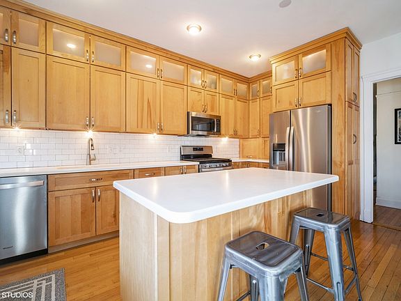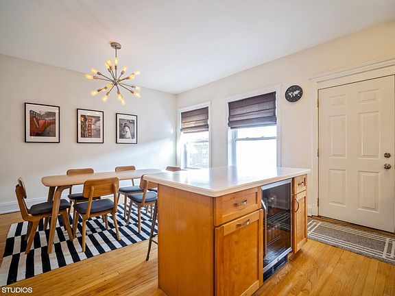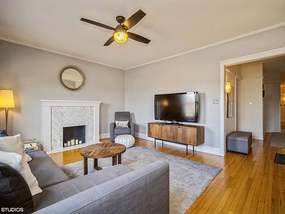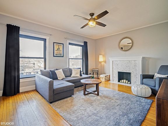 Light and bright well maintained 3 Bedroom top floor condominium is perfectly located just blocks from Lake Michigan beaches and parks and across the street from highly ranked Lincoln Elementary School! Large Living Room with lots of light, hardwood floors and decorative fireplace with chevron patterned carrara marble surround (2017) and bright floor and ceiling trim welcomes you as you enter the home. 3 bedrooms with hardwood floors and large closet spaces. Beautifully remodeled extra large open Kitchen and dining area with a wall of floor to ceiling wood cabinets, corian countertops, newer stainless steel appliances side-by-side refrigerator/freezer, microwave, gas oven/range, and dishwasher, (new in 2021), center island with a wine fridge/beverage cooler, (new in 2019) is perfect for entertaining. Exterior Kitchen door (with newer "Larson" full view back storm door with stowaway screen) leads to back patio deck for outdoor nights. Upgraded bathroom with tub and shower, newer toilet, sink/vanity, fixtures, mirrors, lighting and tile surround with glass door (2017). There is also a large extra deep hall closet for ample storage. Newer neutral paint. Hardwood floors through out. Large 10 x 10 basement storage for this unit included. 3 window air conditioners included. Close to restaurants, shopping, Trader Joe's, Starbucks. Easy access to both CTA El, Metra, and Pace Bus routes. A walker's dream! Don't miss this one!
