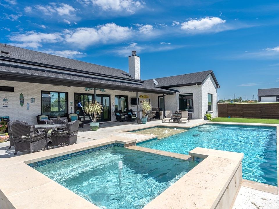 Remarkable, modern 2 story home with the perfect blend of rural and city living. Just 30 min. from Dallas and 35 min. to Fort Worth, this 3 bed, 2.5 bath home is open concept design with a giant kitchen island measuring 10x5 ft, surrounded by stainless steel Kitchen-aide appliances and stunning cabinetry. Large windows throughout the home provide an abundance of natural light, creating a bright and inviting ambiance. Primary Suite is a lux-retreat, complete with walk-in closets, his and her vanities, an adjoining office space, and conveniently connected to laundry area. The outdoor space is perfect for entertaining with a large covered patio, outdoor kitchen, heated POOL, HOT TUB, and play area. Outdoor-two large metal shops, totaling over 5000 SF, ideal for a home biz or rec. space. Guests can enjoy RV hookups. One insulated shop is air-conditioned, making it perfect for future living space. This is a rare opportunity to experience rural living while being close to local amenities.