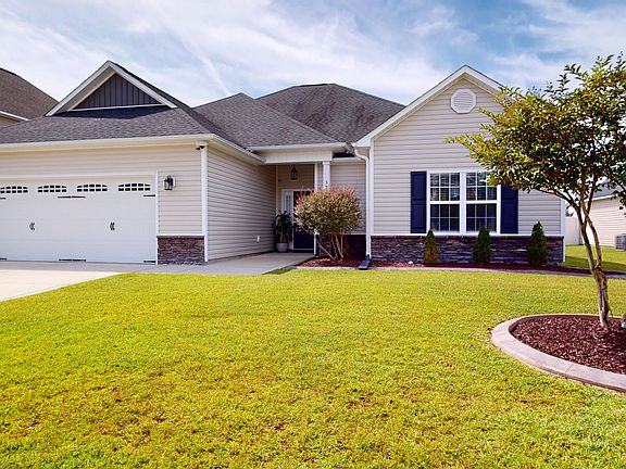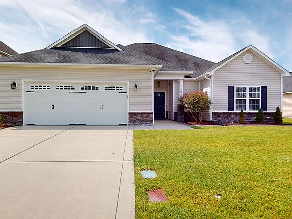 Immaculately maintained, turn key, and ready for new owners! Located in the sought after neighborhood of Carolina Plantations, this stunning home known as the ''Raegan'' floorplan features 3 very spacious bedrooms each with walk in closets and 2 full bathrooms at 1900 heated square feet. The home was recently painted with Agreeable Grey throughout and new plush carpets in all the bedrooms! Just minutes from everything with NO city taxes! The exterior is equipped with vinyl siding accented by stone with a clean, classic landscape. The expansive living room is complete with a vaulted ceiling, ceiling fan, and an electric fireplace situated in the corner. The Kitchen has stainless appliances include a smooth-top range, microwave hood, dishwasher and refrigerator along with a spacious dining area with a back door leading to the covered back patio complete with ceiling fan to enjoy the late summer evenings overlooking the 6ft wood privacy fenced back yard. The master suite is located on the opposite side of the home and boasts a ceiling fan, tray ceiling, and 2 large walk-in-closets. Into the master bathroom you'll find a double sink and vanity, ceramic tile flooring, separate shower and soaking tub. Head on out to the attached two car garage you will find the garage has been equipped with an automatic garage door opener AND an upgraded plug for smart car charging! Call and schedule your own tour today!