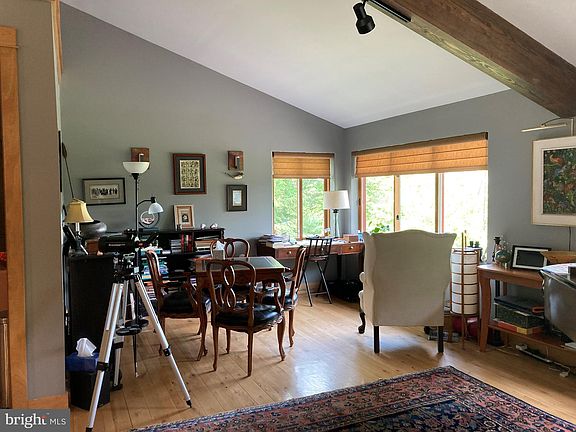 Come and visit this unique, environmentally conscious home perched on almost three acres of the side of Tussey Mountain with spectacular views across the valley, the Penn State campus, Beaver Stadium and the distant Bald Eagle Ridge. In winter the uphill mountain side turns into a panorma of sugar maples, black birches and wildlife -foxes, deer, bear, wild turkey and bald eagles. This wonderful Envinity-built home has a main floor with a great room and open floorplan, including exposed beams that rise to 20 ft at the peak and features a geothermal system. The floors are natural white oak. A cream brick Frank Lloyd Wright style wood-burning fireplace anchors one wall. Enjoy your chef's kitchen with an antique farmhouse sink, a vented, 5 burner induction cooktop and new appliances including under-counter refrigerators and freezer. The dining area has a wall of windows and a glass door overlooking the large, landscaped patio. Also on this level are a powder room for guests, an owner's bedroom and attached full bath, and an office. A recent addition, access through either a stained glass door or an outside patio door, contains a second bedroom suite with laundry room/soaking tub bath. On the lower level, but above grade you will find another living area that includes a family room, two bright bedrooms, and a full bath. This could make a useful mother-in-law suite or serve as a living space for teenagers. The floors on this level are concrete with radiant hot water heat and cooling. A utility room here includes a second refrigerator and large sized washer and dryer as well as an integral two car garage. The garage has a convenient wash up sink, and another utility room with temperature and humidity controls for your wine cellar. But wait, there's more! The grounds are professionally landscaped with many unusual specimen trees, an extensive flagstone patio with dining areas and a fire ring. And on the other side of the house a garden is already established for you along with a garden shed. What more could you want? Welcome home!