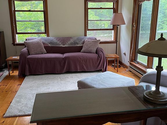 Wouldn't you love to live in Montague? Walk to the Bookmill or around town every day, surrounded by the peace and quiet of the countryside, yet in a lively, active community of people who care about where they live? Well, I may be able to help. I have a 2-bedroom, 1 bathroom furnished home that's available from early September through the end of April. The house is sunny, spacious, and open, and includes a garage space. You pay utilities (gas for cooking and hot water, electric heat, shared wifi); I take care of the lawn (it's on an acre of land). It is an open-plan, sunny, country home with big closets for storage, wood floors in the bedrooms, and across the open living/dining room, carpets in the entryway and on the stairs, linoleum flooring in the kitchen and bathroom, a gas stove in the kitchen, and a deck out back. You'll find peace and quiet here. Montague Center is one of the hidden gems of western Massachusetts. It is an active, involved community where people get to know each other through a wide variety of cultural and social events, yet there is plenty of space and privacy as well. And it is close enough to highways as well as local colleges and universities, not to mention Boston and New York City to offer easy access to a rich diversity of cultural, social, and business activities. It sits in the midst of some of the best biking, hiking, and cross-country skiing in the area. House features: 1. Comfortably furnished 2. Rural, retreat-like setting 3. Cool and shady in summer, warm and sunny in winter 4. So wonderfully quiet all you hear is birds and peepers when you leave your windows open at night. 5. One of two detached, private units with beautiful views of the surrounding hills, woods, and fields. (the second separate unit is a studio over the garage in which there will be one quiet person.) 6. Wide-board pine floors in the living and dining areas, and both bedrooms upstairs 7. Two large second-floor, corner bedrooms with large closets 8. Spacious kitchen with pantry and appliances (refrigerator, microwave, gas stove, dishwasher) 9. Washing machine in the basement, with hookup for dryer if you want one. 10. Garage space for parking one car with a garage-door opener (nice on those snowy days). Utilities: 1. Heat is electric and passive solar, estimated at $250/mo average over the year (highly dependent on your usage, of course, along with fluctuating energy prices at the moment). 2. Newer, efficient wood stove in the living room (if you use it, you have the chimney cleaned). 3. Gas range and gas-heated hot water (est $99/mo, again dependent on your usage and current fluctuating energy prices) 4. You pay all utilities and take care of your own snow removal (shovel or snow-blowing; I do not allow plowing) 5. I take care of lawn care; recycling is free, you pay for trash collection with a $3 sticker for each barrel. Getting Around: Nearby are hiking and cross-country skiing trails, streams for fishing, rivers for boating, and low-traffic biking roads. Also located 10 minutes from Route 2; 15 minutes from Route 91, UMass, and Old Deerfield, and 20 minutes from Amherst College, as well as schools such as Northfield Mount Herman. Twenty-five minutes from Smith College, Northampton, and Hampshire College. Less than two hours from Boston across scenic Route 2, and 3 to 4 hours from New York City depending on traffic. And there are free tennis courts within 15 minutes! Ideal for quiet, non-smoking, low-chemical-use people looking for a peaceful, homey oasis in a hectic schedule. Please note, there is no smoking -- of anything by anyone anywhere on the property. If you smoke, please pass this one by. I do not accept pets. This is an 8-month rental -- I plan to return in May, so it will not be renewable.