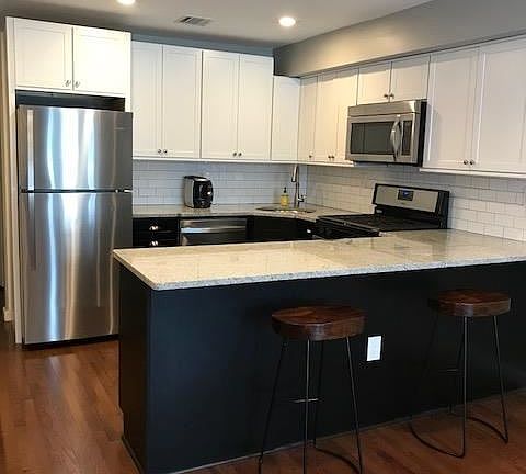 Gorgeously renovated 2 bedroom apartment with central air in the Riverview Arts District of Jersey City Heights. Just minutes to the 9th St Light Rail, this apartment is loaded with modern features that you'll love! Well laid out floor plan and an abundance of light from the bay windows in your living room. Stylish kitchen with Whirlpool stainless appliances including microwave and dishwasher, granite counters, two tone cabinets and subway tile back splash. Nicely updated full bath has honeycomb tiles, granite vanity and subway tile in the shower. Washer and dryer in your home, recessed lighting and terrific closet space. The convenient location offers close proximity to NYC, many mass transit options, affordability, great parks, and a 240 storefront main street making this neighborhood an awesome place to call home!