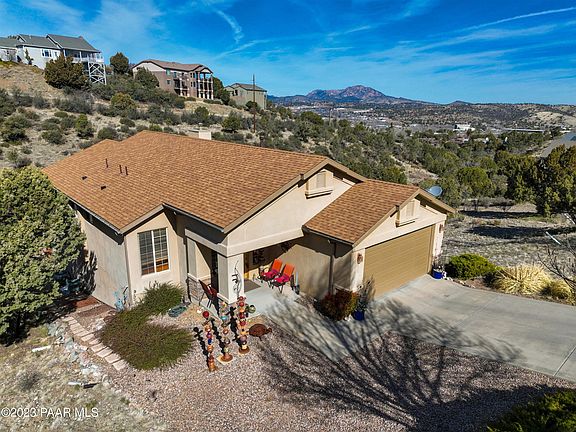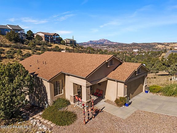 Gorgeous views of Prescott city lights and Granite Mountain greet you daily from the kitchen, dining, living room and two large decks of this open floor plan home minutes from downtown Prescott. Enter and live on the main level with granite countered kitchen, custom cabinetry, open dining area, and cozy living room warmed by a stunning quartz inlaid fireplace. Durable Strand Bamboo flooring throughout provides additional natural warmth. The primary bedroom with ensuite bathroom and walk-in closet also accesses the main deck for watching sunsets. An additional bedroom and laundry room completes the main living level. Limitless options downstairs...living area, game room, craft room, playroom, shuffleboard...you name it. With two bedrooms, one bath, and deck downstairs - bring the guests